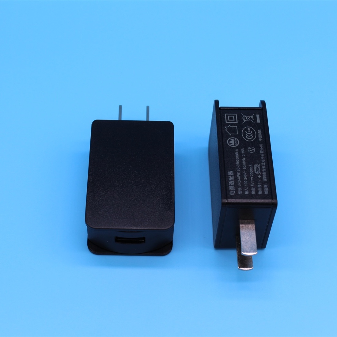 5V2A China pin USB power adapter,5V2A CN plug USB charger; Model: JHD-AP013C-050200BB-A, output 10 watts,high efficiency,low loss,built in EMC/EMI filter, Safety Approval: CCC,PSE,UL,FCC,CB,GS-TUV,CE. widely used in the electronic digital,communication.